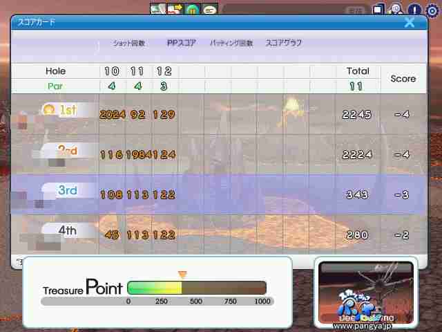 新年早々狂いまくる日程に付いて行けてないごくあくです(´・ω・`) まあ、年も変わったと言う事で昨日は新年初パンヤとなったのですが折角の経験値&PP2倍期間中と言う事で少ない経験値2倍デーを活用するため大晦日から経験値稼ぎプレイをしていたのですがそんな中訪れた新年一発目の内容はと言うと… いきなりこんな高速チプからスタートw この回の結果はと言うと… こんな感じでした。 そしてこの後もがめぽのお年玉的展開wで高速素チプを量産w 結構決まりましたね^^; この調子でいつも決まってくれればなぁw まあ、今年はスコア的には目標…って感じじゃ無いので当面は無印のプロ昇格を目指してみようかと思ってます。
