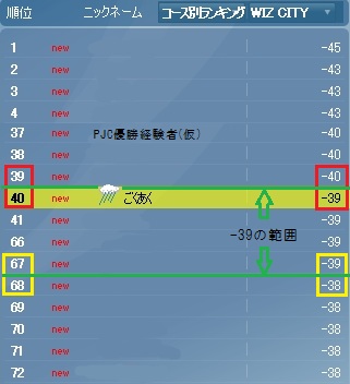 と言うか今週のランキングトップは-45とかその5本どこで決めたんだと・・・ねw と、言うことで今週のランキングはこんな感じ 40位に付けていましたがここって同スコアの最上位…前日の大会でPP差で負けた相手が48位にいたことからPPは他に比べて低いはずなので同スコアの場合PPが低い順に並んでいるのかも知れませんね。 とは言え最悪でも67位なので1次は問題ありませんし事故ベスだったDIの90位を上回る過去最高なのは間違いありませんけどねw ま、2次は今週ではなく来週のようですので参加出来たら行って見ますかね。もっとも、現時点の予定だと仕事で出れませんけどね。 |